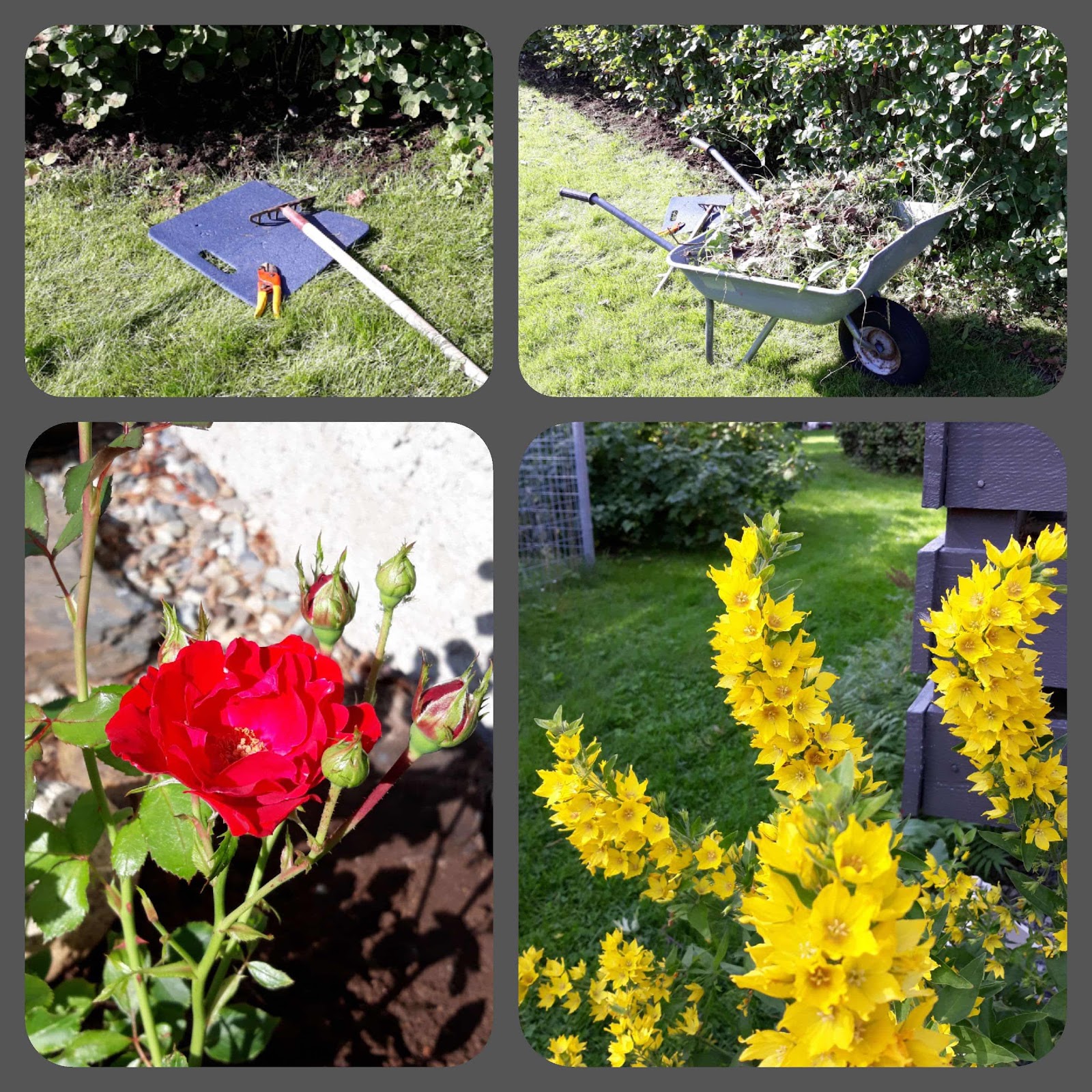 Endelig en solrik augustdag, etter mange dager med gråvær og regn. Det inspirerte til en innsats i hagen. Ugresset og plena vokser raskt, så nå var det behov for et krafttak. Mange planter har blomstret fra seg for sesongen, men en god del er på sitt fineste nå. To fulle trillebårlass med ugress, og ei nyklipt plen ble resultatet av dagens jobb. Tid til avslapping i sola ble det også. Litt vind bidro til fin klestørk i godværet.